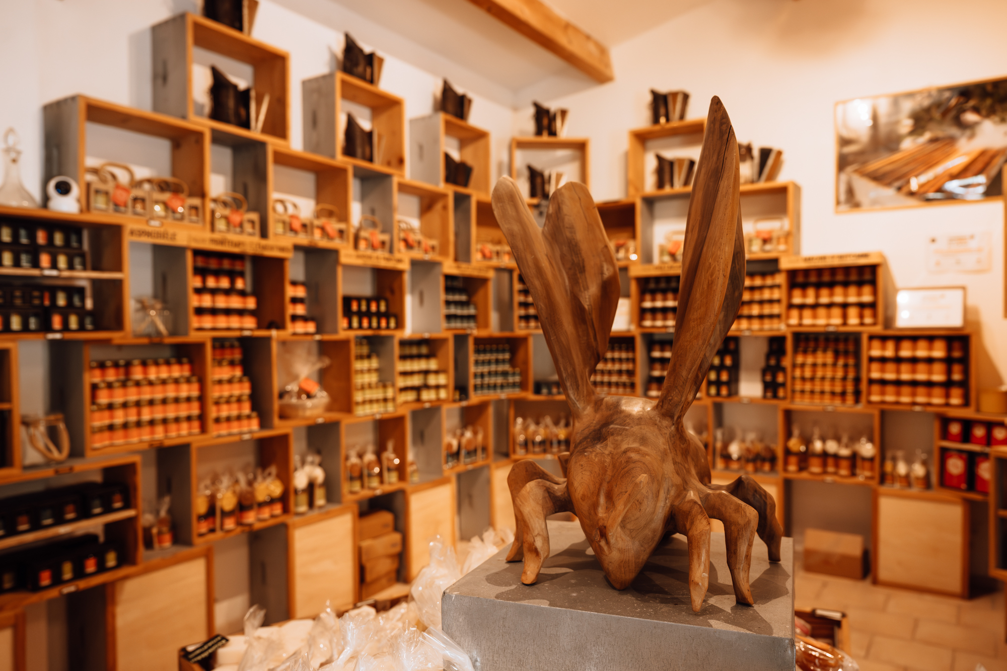 La boutique est un émerveillement. Elle est conçue comme une ruche géante, avec des alvéoles en bois, des pots de miel tous plus tentants les uns que les autres, des confitures et produits dérivés, comme une bière au miel absolument délicieuse.
