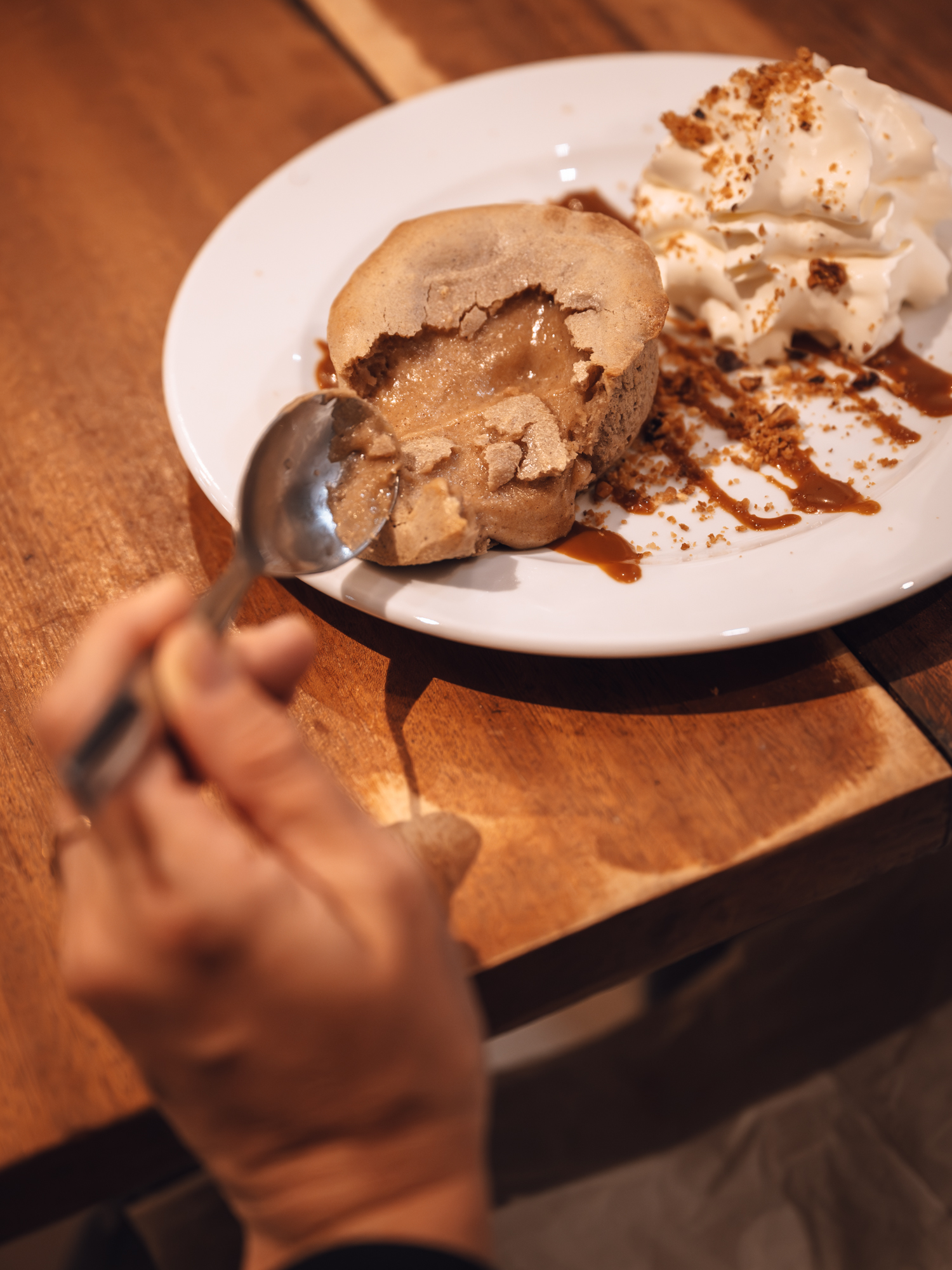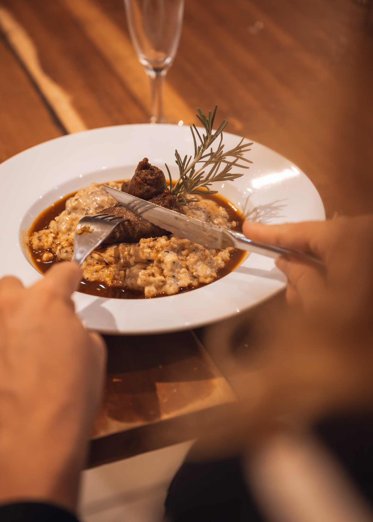 On s’installe près de la grande cheminée, où la viande est grillée minute : entrecôte gigantesque, magret de canard, linguine aux champignons… Les portions sont monumentales, probablement les plus grandes que j’aie vues de ma vie. Un repas typique, généreux, savoureux, dans un lieu chargé d’âme : c’est une expérience forte, à vivre au moins une fois !