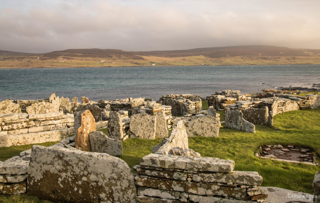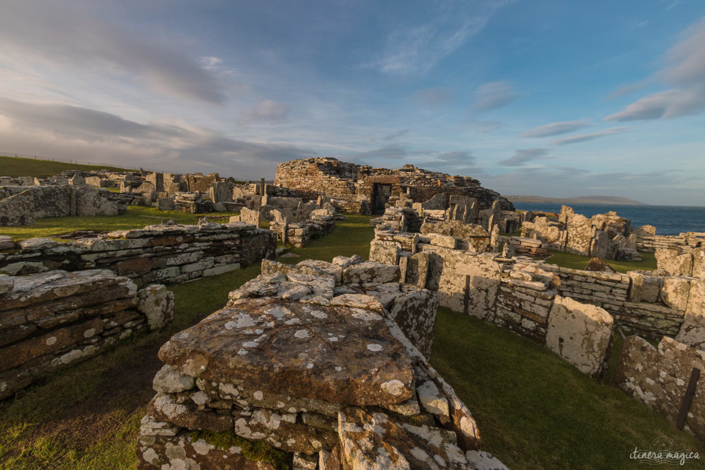 Les sites des Orcades sont encore plus anciens, et sont souvent cités parmi les plus exceptionnels au monde. A Skara Brae, vous remontez 5000 ans dans le temps, plus loin encore que les pyramides d’Egypte. Considéré comme le village néolithique le mieux préservé au monde, Skara Brae est inscrit à l’UNESCO à ce titre, et souvent surnommé « le Pompéi écossais ». Le site est réellement magique, et visuellement très proche de celui du Jarlshof : en bord de mer, des habitations semi souterraines appelées middens déploient leurs formes rondes et leurs portes de pierres plates superposées, nous faisant entrer dans un étrange labyrinthe circulaire qui relie tout droit à la nuit des temps. Le site est de toute beauté.
