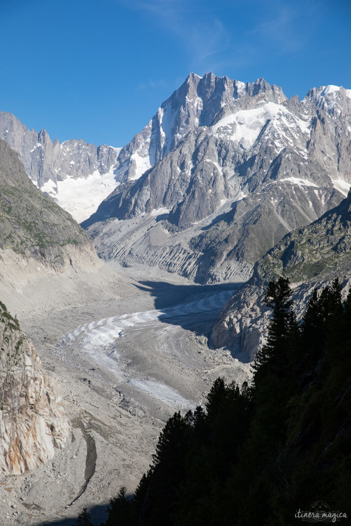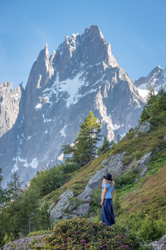 Chamonix est, sans hésitation aucune, un des lieux de l’univers qui font battre mon cœur le plus fort. Difficile d’exprimer la sensation de joie pure que je ressens quand j’arrive dans cette vallée étroite où les langues glaciaires descendent jusqu’aux terres des hommes, où l’Aiguille du Midi griffonne l’azur du ciel avant que surgisse, monstrueux et magnifique, le dôme enneigé du Mont Blanc. Après un merveilleux premier séjour à Chamonix à l’été 2017, Marion et moi sommes revenues passer quatre jours au pays des glaces et des cimes en juillet 2020, et notre amour pour cette destination n’en fut que décuplé.
