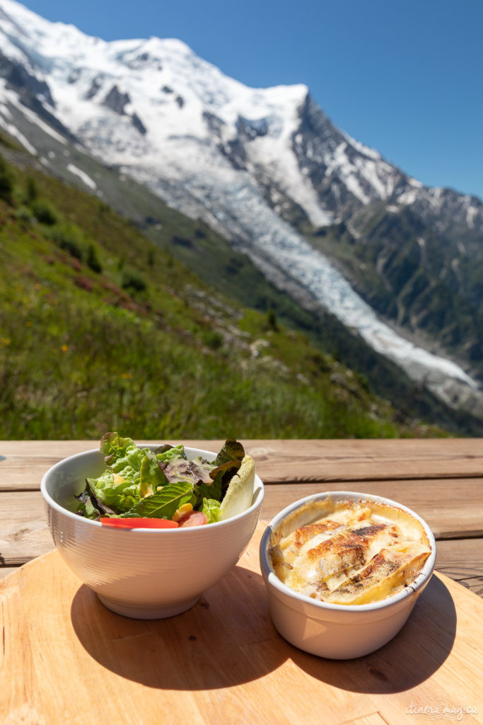 On trouve à Chamonix un type de restaurants qui nous a énormément séduites, Marion et moi : les buvettes d’altitude. Ce sont de petits cafés/restos situés très haut et accessibles seulement aux marcheurs (au terme de promenades plus ou moins longues : certaines buvettes sont à 1h de marche de la télécabine la plus proche, d’autres 10 min seulement). Elles ouvrent en été et sont ravitaillées par hélicoptère, lors de rotations très impressionnantes : l’hélico arrive, dépose la cargaison de nourriture et repart avec les déchets ! Ce sont de véritables oasis idylliques au cœur des montagnes, où la sensation de dépaysement est radicale. Si vous venez à Chamonix, je vous recommande vraiment de leur rendre visite.