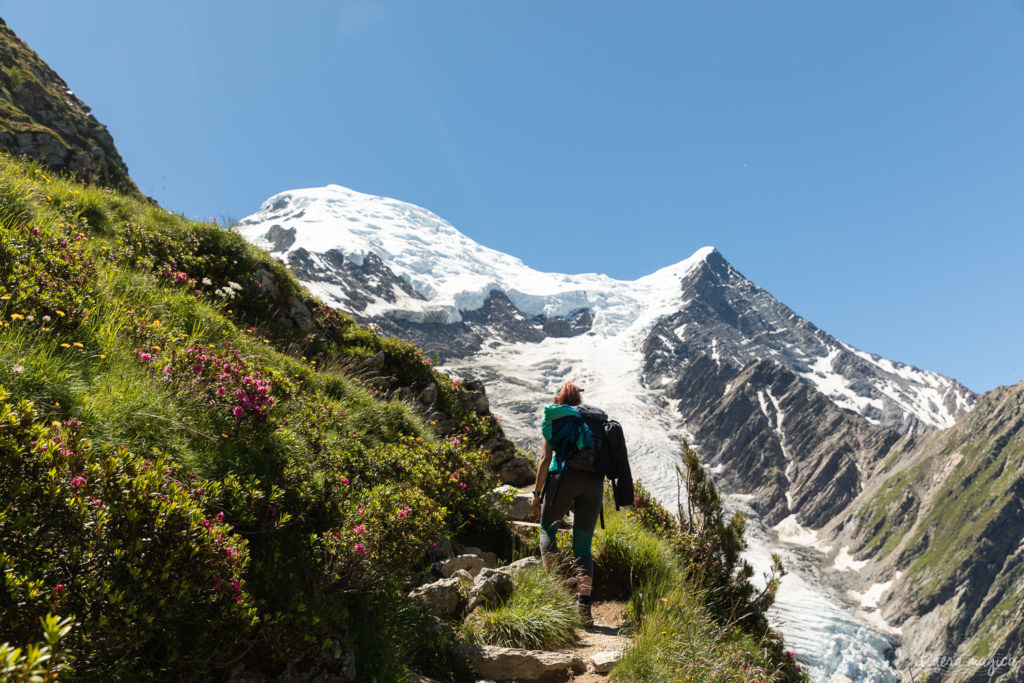 Après notre nuit magique à l’hôtel du Montenvers, nous entreprenons la belle traversée par les balcons Nord jusqu’au Plan de l’Aiguille, au pied de l’Aiguille du Midi. Cette randonnée assez facile d’environ 3h offre un concentré de paysages mythiques de Chamonix : partant du Montenvers, on s’élève jusqu’au Signal de Forbes, qui surplombe la Mer de Glace, avant de longer la vallée de Chamonix en direction de la silhouette triomphante de l’Aiguille. Les roses des Alpes encadrent le glacier tout au long de l’ascension vers le Signal, et le ciel éclatant souligne la beauté pure de ces paysages gorgés de lumière… nous sommes heureuses, enchantées.