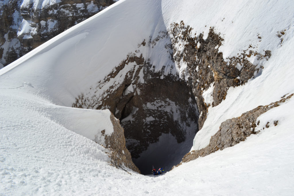 C’est celui qui me fascine le plus. Un véritable défi, à réserver aux alpinistes et skieurs de pente raide de haut niveau, très bien préparés et encadrés – ici l’erreur ne pardonne pas et toute chute sera fatale. Le chourum Olympique traverse le flanc Est du Grand Ferrand, transperçant la montagne comme le conduit d’un boulet de canon dont le skieur émergera tel une fusée jaillissant des profondeurs. On y accède par la remontée de deux grottes ouvertes sur le ciel, une vraie course d’alpinisme avec piolets et crampons dans la raideur des pentes quasi verticales de la montagne à cet endroit. Après cette remontée, on arrive à une sorte de boyau traversant les grottes de façon spectaculairement esthétique, sur une pente ultra raide, étroite et gelée que seuls les meilleurs skieurs sauront négocier afin de déboucher de l’autre côté de la montagne. Lisez ici le récit d’un guide de haute montagne réalisant cette course de haute volée…