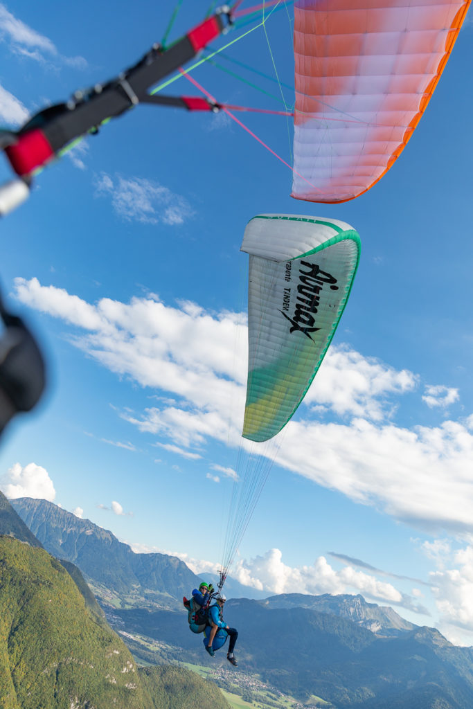 J’avais choisi de voler avec Airmax Parapente, notamment parce qu’ils étaient situés directement sur le col de la Forclaz et proposaient un rendez-vous là-haut, et j’ai pris un vol en ascendances, permettant d’aller chercher les courants dans les hauteurs et de voler plus longtemps. J’ai été très heureuse de mon choix et j’ai adoré mon moniteur, Vincent, adorable, pro et passionné. A la fin du vol, les autres moniteurs d’Airmax se sont prêtés au jeu pour mon appareil photo et j’ai eu droit à quelques visions géniales de parapentes qui se croisent… avant de finir mon vol de façon acrobatique avec une « sat », une vrille à 360° à toute vitesse (ça secoue bien fort !). Un moment de pure magie qui refermait la magnifique parenthèse sur le lac d’Annecy…