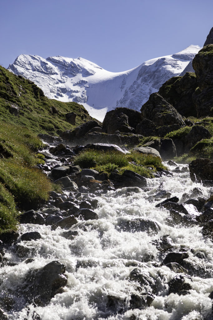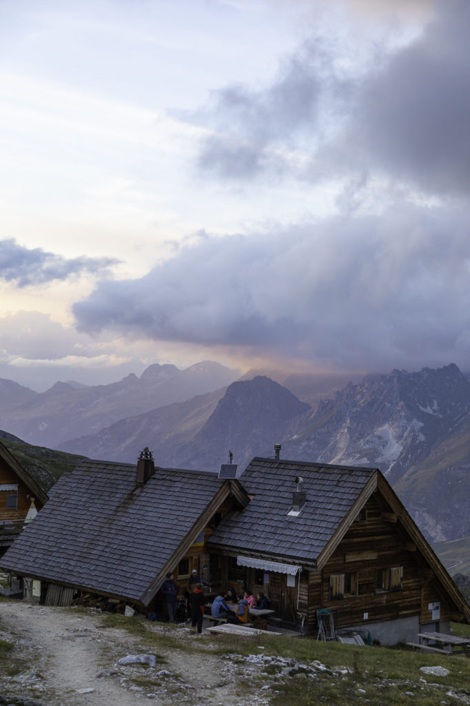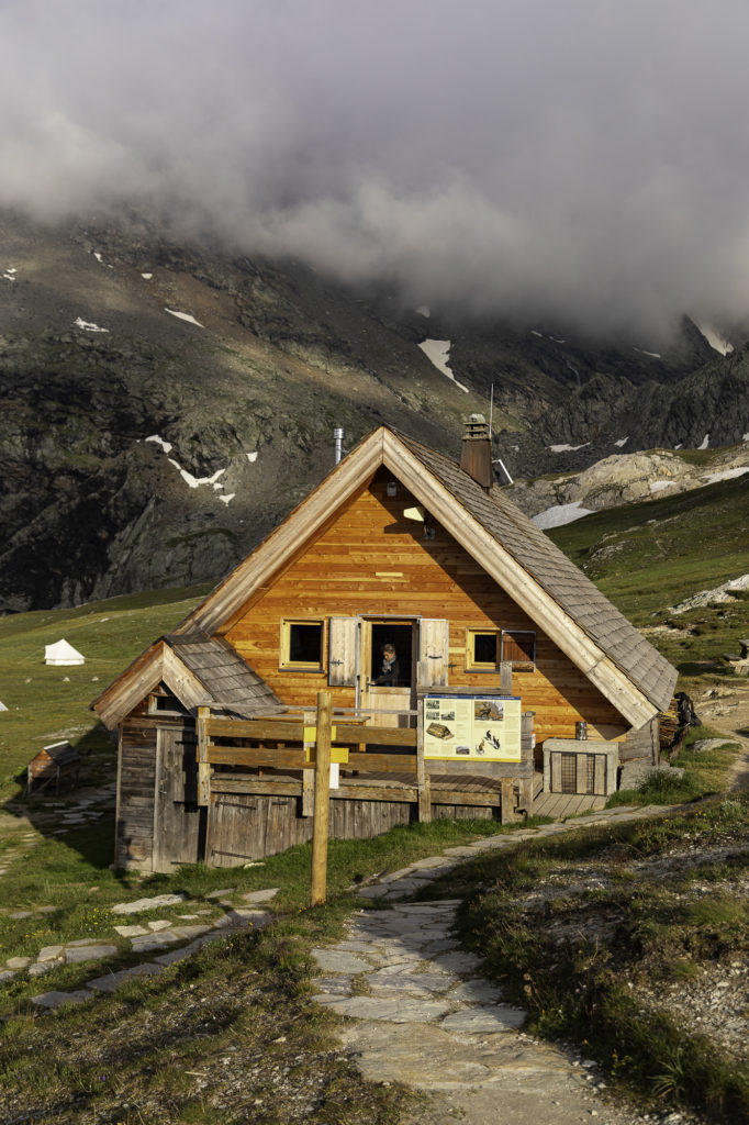 La montée vers le refuge de la Valette est une très belle entrée en matière. Au milieu des cascades, nous montons des alpages aux rochers sculptés, en croisant une faune déjà très abondante, marmottes, rapaces, bouquetins. À notre arrivée au refuge de la Valette, c’est un choc esthétique : le refuge est perché au milieu d’une prairie alpine suspendue, entre falaises et glaciers, et des dizaines de bouquetins broutent tranquillement. J’ai l’impression d’avoir plongé dans un rêve. Cette première soirée est sublime.