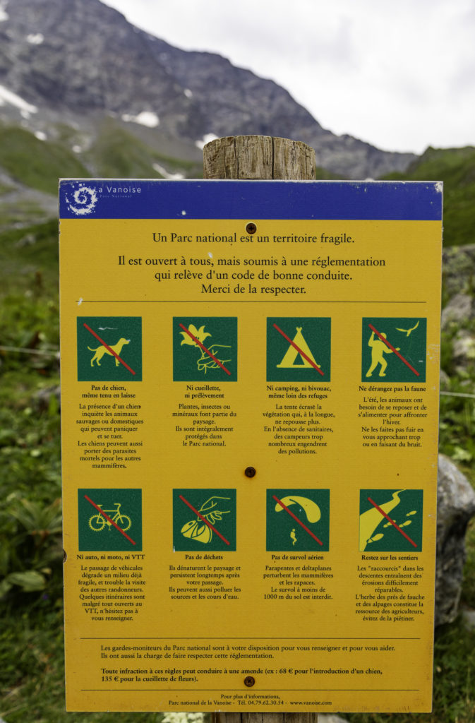 Chaque jour de ce trek, nous entrons dans le cœur du Parc national de la Vanoise. Les petits drapeaux français peints sur les rochers signalent l’entrée en cœur de parc, un trésor national placé sous notre responsabilité collective, et qui implique une réglementation à respecter.