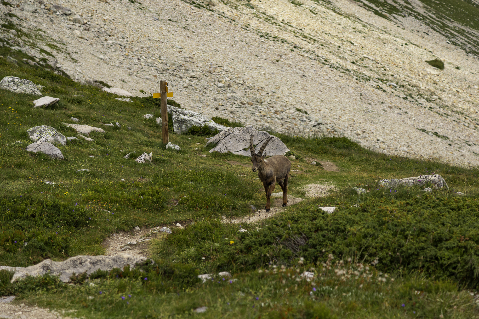 Nous continuons sur des sentiers panoramiques d’une beauté inouïe, et arrivons en plein milieu d’un véritable festival de bouquetins : partout autour de nous, au milieu des chemins, jeunes et adultes, étagnes et bébés, ils nous réjouissent.
