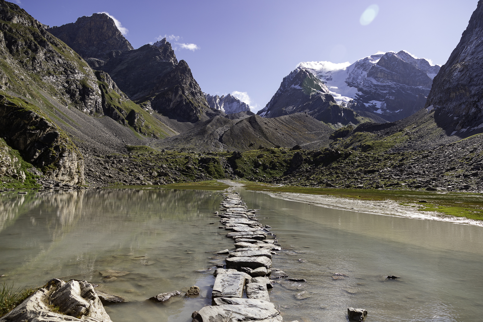 Je savais que le dernier jour nous réservait un dernier éblouissement, avec un des lieux les plus iconiques des Alpes, une véritable carte postale grandeur nature : le lac des Vaches et sa marelle de pierre. Entre glacier et ciel, ce chemin de dalles d’ardoise court au milieu de l’eau, incroyablement photogénique et poétique. Aucune déception, le lieu est à la hauteur de sa réputation : il est splendide.
