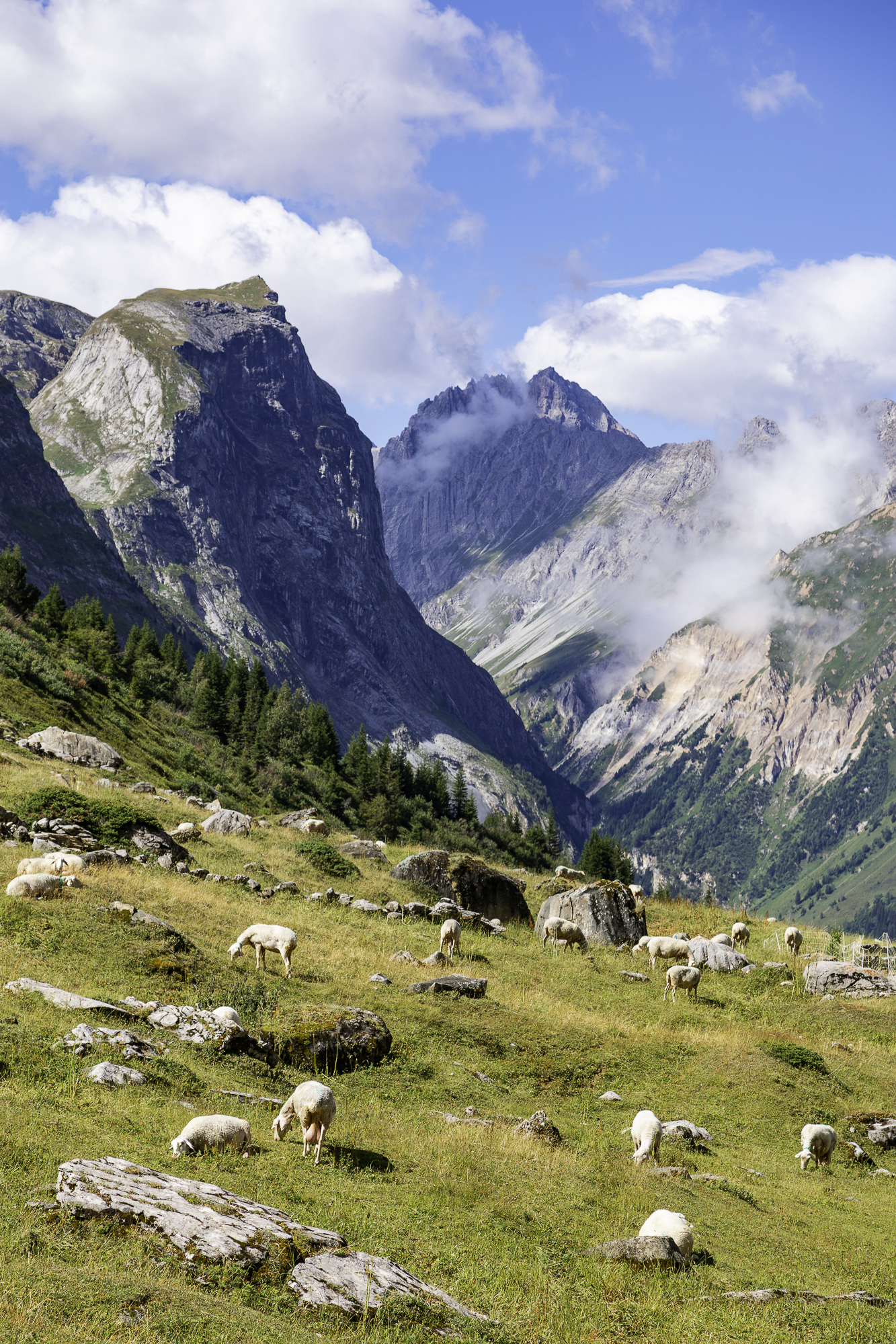 La descente vers Pralognan traverse un paysage d’îlots alpins, de cascades, de ruisseaux, de troupeaux blancs en harmonie avec les sommets enneigés. C’est beau à en pleurer. Qu’est-ce que j’ai aimé cette semaine…
