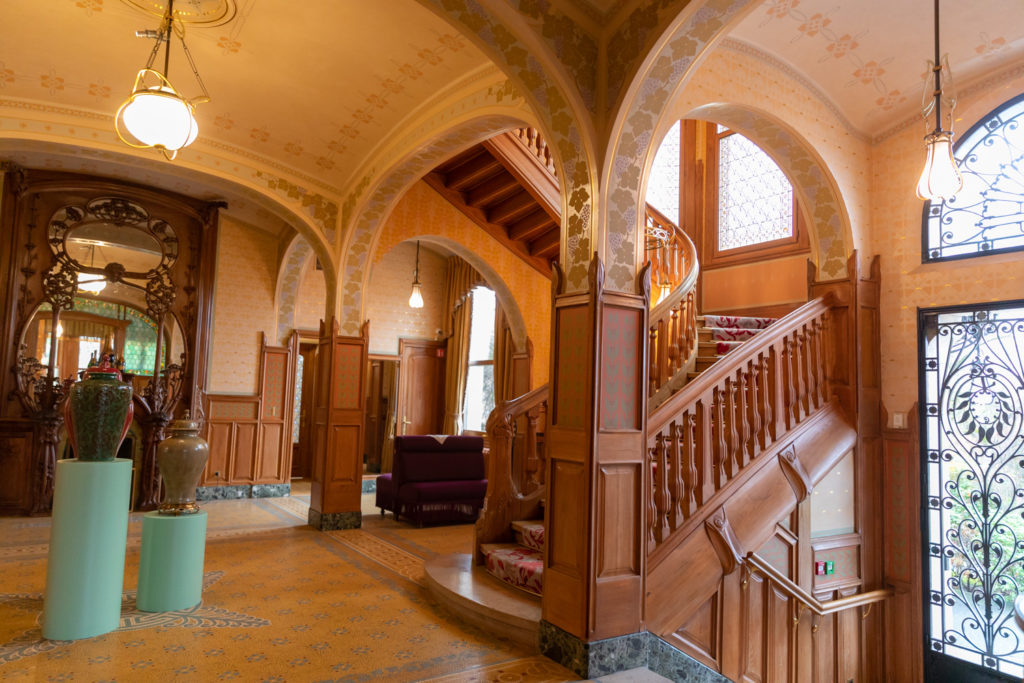 Chez Vranken-Pommery, la visite s’achevait par celle de la sublime villa art nouveau Demoiselle, avec ses courbes en coup de fouet, ses scènes japonisantes, ses ébénisteries de Selmersheim « en chapeau de gendarme », ses verres Lalique et ses iris typiques de l’école de Nancy. Chaque pièce est un ravissement. L’énorme lustre de 350kg, disparu lors du pillage de la villa abandonnée dans les années 1970, a été refait à l’identique par les métalliers champenois, et c’est le clou de la visite !